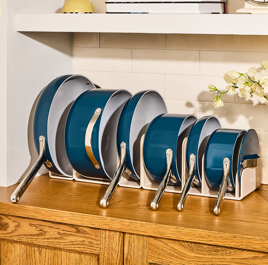 Ditch the chemicals with Caraway’s ceramic-coated cookware. Our complete set comes equipped with pan & lid storage units to keep your kitchen organized.